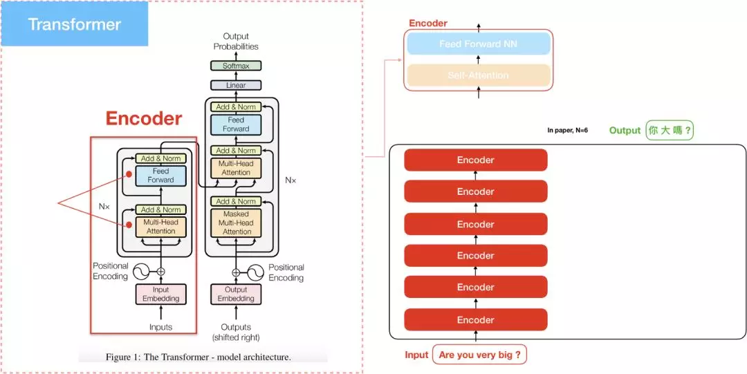 我们将”The transformer”模型分为左右两部分,左边是Encoder,如前述,”Attention is all you need”当中N=6,代表Encoder部分是由6个encoder堆积而成的。其中在计算encoder self attention时,更透过multi-head的方式去学习不同空间的特徵,在后续内容会探讨multi-head的部分。