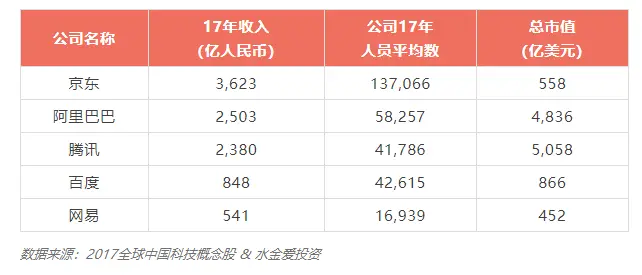 2019 校招正在火热进行中,有哪些互联网公司值得你加入呢? 首先,BATJW 镇楼!根据 2017 年公司年收入情况排名,我们可以看到眼下 IT top5 的公司年收入、职员数和市值情况。京东在 17 年总收入稳居榜首,市值最高是腾讯,突破 5000 亿美元大关。
