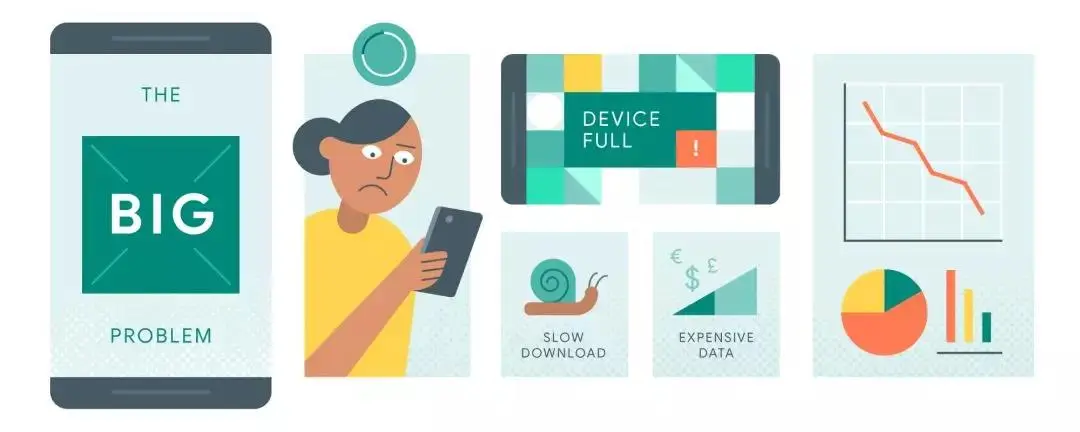 挑战在于:应用的体积越来越大了。事实上,自 2012 年以来,应用体积平均增长了 5 倍。这很好理解: 您希望为应用添加炫酷功能和新内容,以确保用户留存/回归并保持业务增长。设备性能越来越好,您希望能把那些闪亮的新功能利用起来。设备生态系统变得更加多样化了,因此您决定复制应用中的代码和资源,使其在大屏幕和小屏幕上都能流畅运行,在不同种类的 CPU 上都能流畅运行,等等。