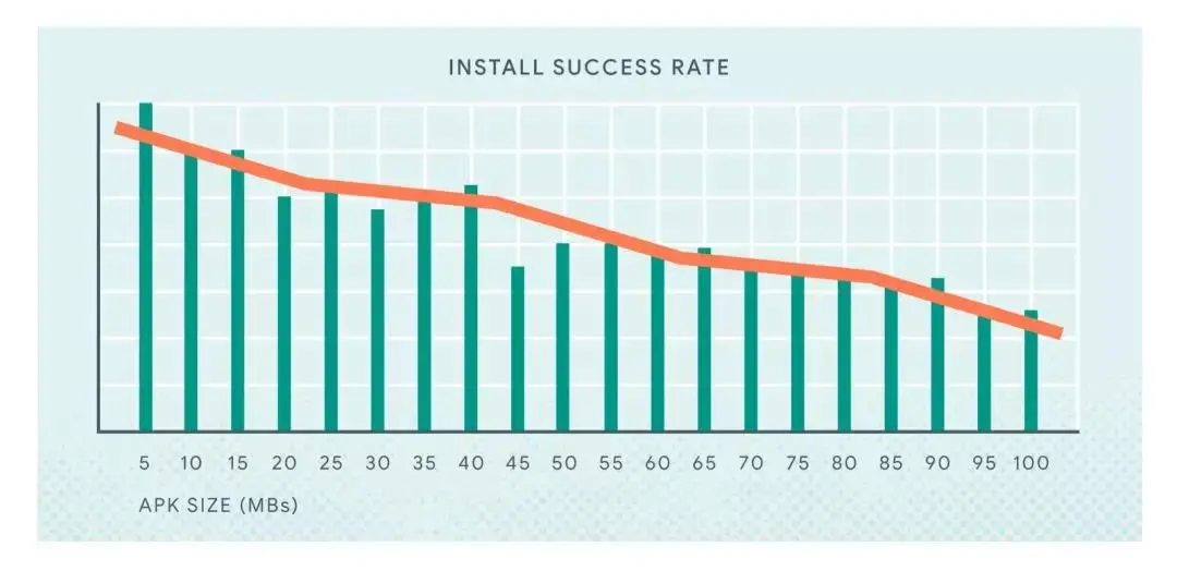 如果每个用户都拥有无限的存储空间、无限的数据流量和永远存在的快速连接,那么应用越来越大并没有什么问题。遗憾的是,事实并非如此 (当然我们希望有一天能够如此!)。通过查看下图,您可以看到 Google Play 上的应用大小与其安装转化率呈负相关关系。这意味着随着应用变大,其安装率会下降。出现这种情况有很多原因:许多用户的设备上没有足够的可用空间。用户可能在使用存储空间一般的入门级设备,即使对于那些拥有高端设备的用户而言,他们的照片、视频和其他媒体文件的品质也在逐渐提升,从而占据了越来越大的空间,设备上的可用空间正在逐渐紧缩。用户也不希望一边用着昂贵的流量套餐,一边等待大型应用去慢慢连接网络,在新兴市场尤其如此。