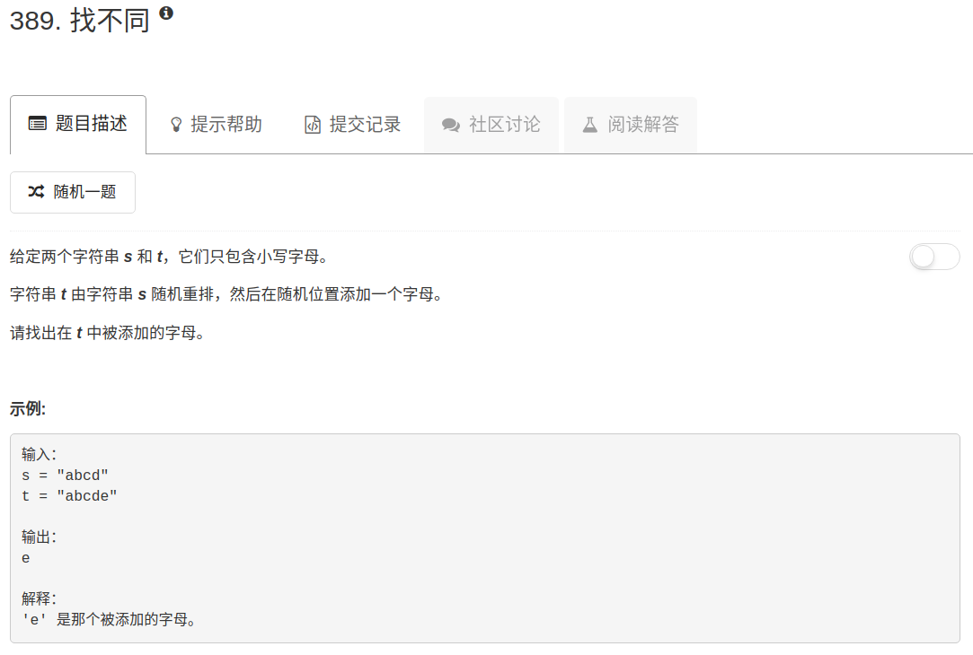 因此,我们可以将 s 和 t 中的元素按位异或,相同的元素按位异或之后都会变成零,最后的结果即为所求。