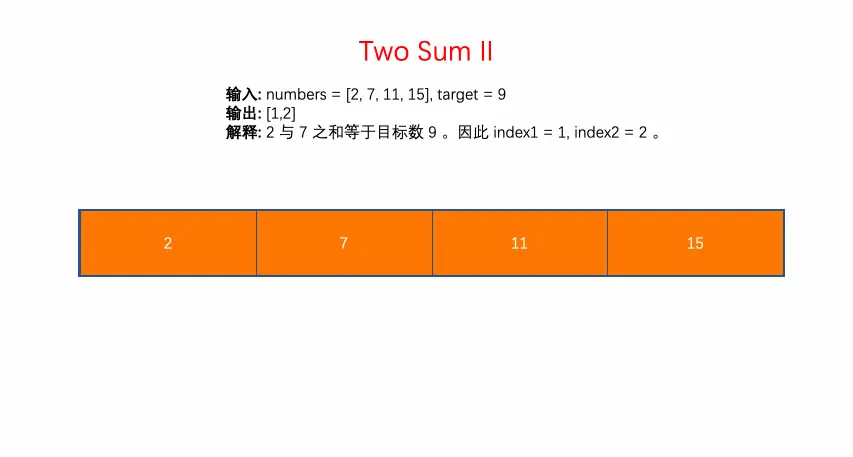 输入: numbers = [2, 7, 11, 15], target = 9 输出: [1,2] 解释: 2 与 7 之和等于目标数 9 。因此 index1 = 1, index2 = 2 。