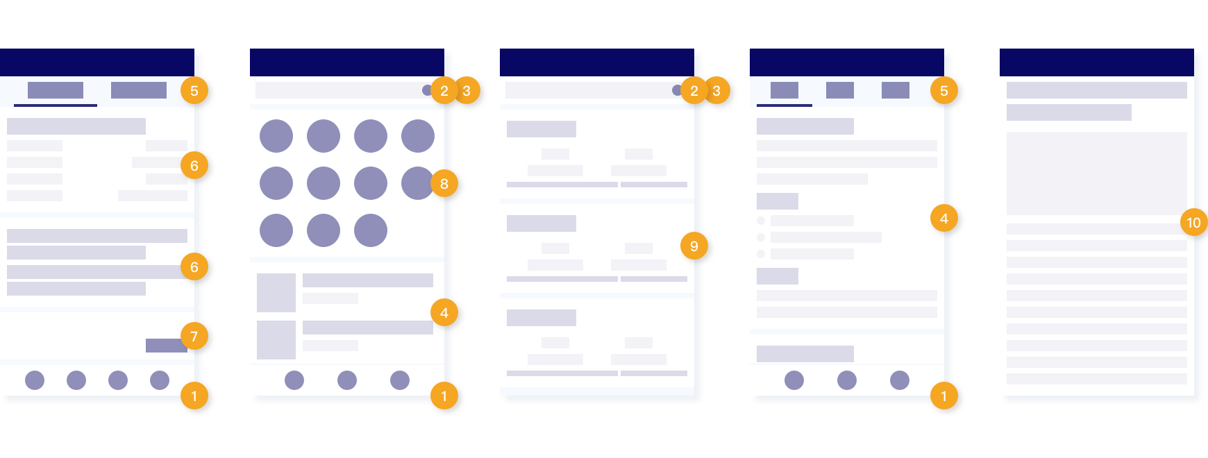 通过将同一类别页面进行横向对比,提炼出各类别中功能覆盖范围最大的代表页面,并以组件的维度进行标记。最终,将 160 个页面所包含的元素拆解为 3 个大类别下 10 种组件: