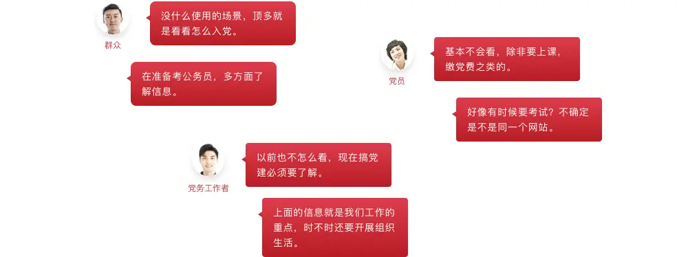 经过对群众、党员、党务工作者的访谈,最终得出群众和党员的需求类似,以办理党员相关事务为主,过程中会顺带查看党建相关信息;而对于党务工作者来说,使用智慧党建网站将在他们的日常工作场景中占有较大的比重。