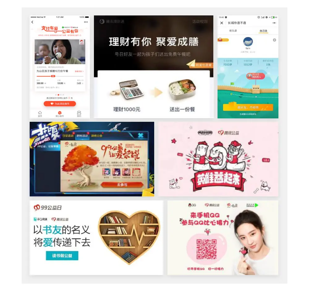 结合产品原有特点,赋予公益的能力,打造适合产品的独有公益形态,即为产品拓展了公益场景,也可吸引原产品用户通过简单的参与形式参与到99公益日来。本届99公益日与20多款线上产品进行合作,运用行为捐赠的模式,打造了买买买(捐公益币,爱心理财,爱心还款),玩玩玩(捐金豆,打赏歌曲,爱心头像框),看看看(捐读书时间,看公益直播),走走走(运动捐步,公益跑步大赛)等形式多样的公益玩法。