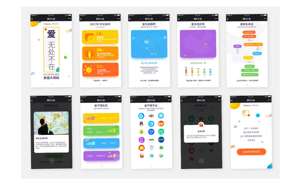 我们以表达“爱无处不在”的活动主题为叙事主干,再通过对活动总体数据、用户参与的地域、参与的形式、参与的平台等多个体现活动影响维度与连接效果的数据进行设计包装,将99公益日的数据通过腾讯公益平台、公众号、合作平台、媒体对外进行推广。
