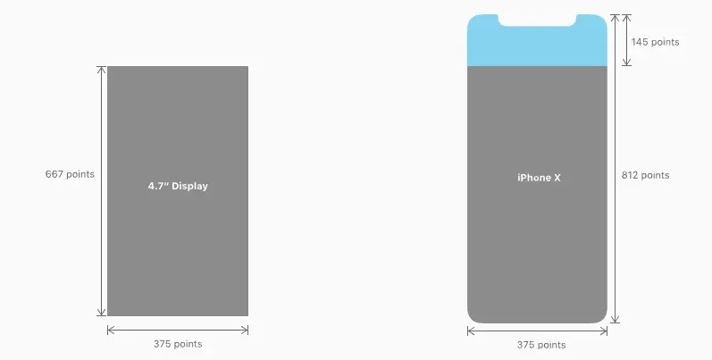 先来看看尺寸,不管物理像素如何,我们用逻辑像素来做设计。iPhone X 的逻辑像素宽度并没有变化,与iPhone 6,7和8相同。只是长度增加了145pt。当设计@1x时 (iPhone 6,7:375X667pt),做iPhone X的适配的话,画布建为375x812pt。