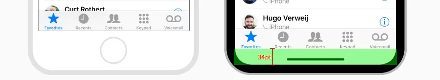 除了顶部的变化,底部工具栏也有改变,看到右图的黑线了吗?这是新的home indicator。由于它在屏幕中,避免干扰操作,这个区域需要空出来,官方文档距离是34pt。