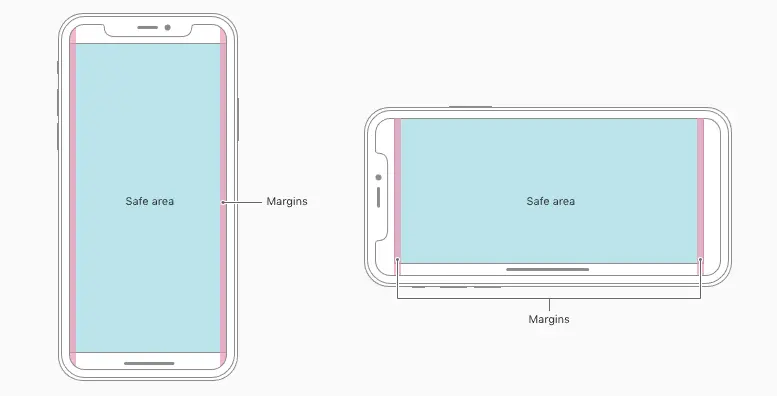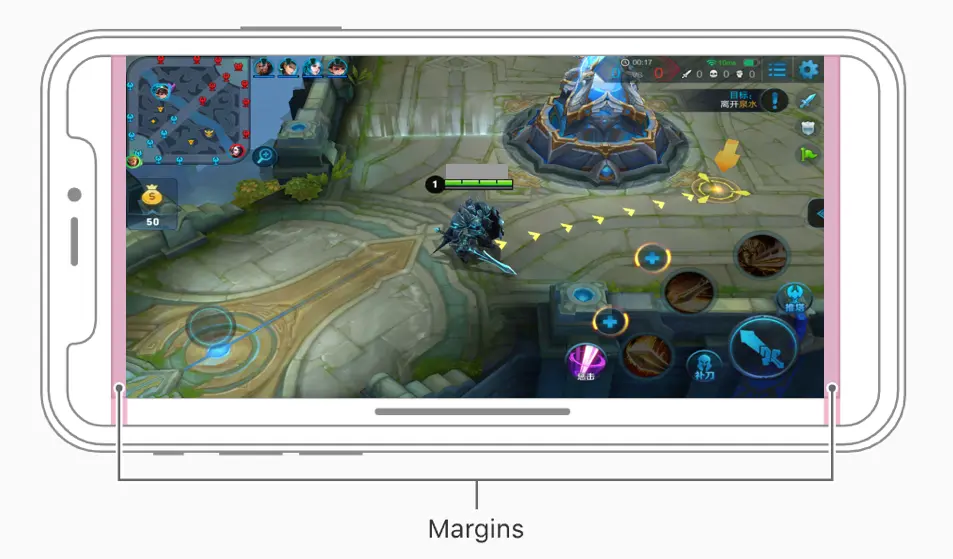 虽然说顶部状态栏44pt,底部home indicator是34pt,但是我们无法控制用户是向左还是向右横屏,因此两边如果要放功能按钮的话,左右留出44pt+10pt的范围,底部留出home indicator的34pt。背景和无关紧要的图则充满屏幕。