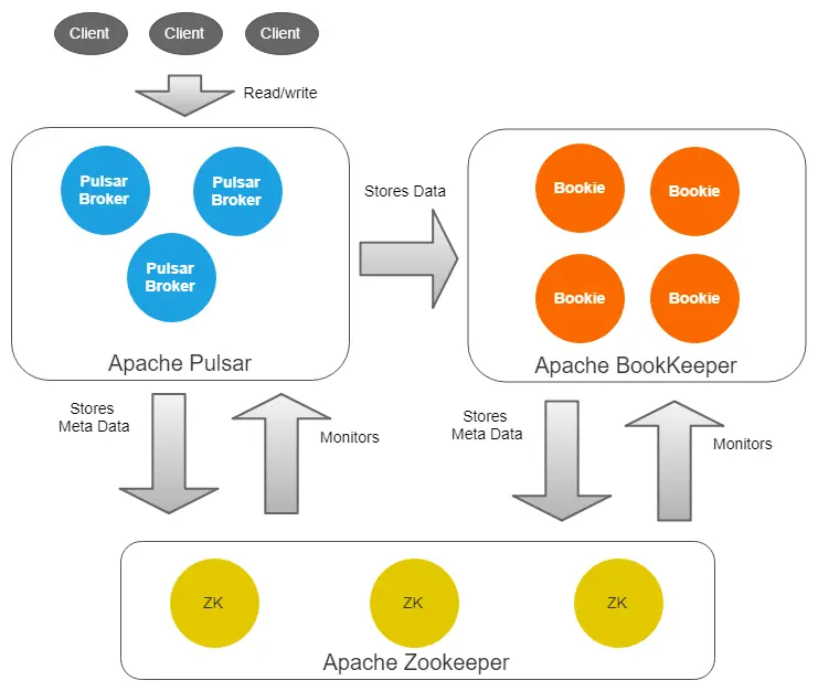 在架构层面上,Pulsar 使用了最前沿的将计算和存储相互分离的思路,将传统的消息中继(Broker)和消息存储(Storage)分开,从而将原有的消息中继(Broker)变成一层无状态化的服务层。将 Broker 变成无状态化之后,Broker 和存储可以相互独立扩展,同时 Broker 的失效恢复可以在极短的时间内完成,从而大大提高了服务的可用性。而且这种分层架构也让 Pulsar 可以很容易部署在 Kubernetes 这样的容器编排环境里面,最高效地使用云原生的基础架构。
