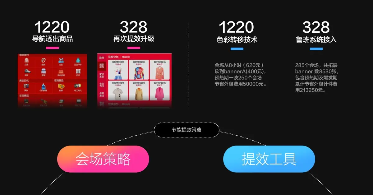 无线会场导航效率提升-增加左侧分类,帮助用户快速切换会场,增加会场内容区的对比度,便于用户搜索和查找。将导航内容在一屏内完全展现,效率超出1220的展示方案。后期迭代预计将产品展示补充为个性化展示,将单坑价值最大化。同时本次328已在会场多点中尝试首图个性化,在有限资源位中,提升更多个性化商品曝光,从而有效提升点击转化。