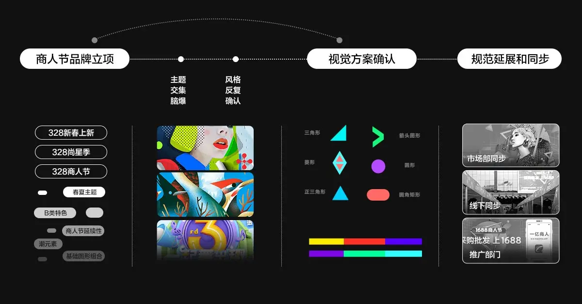 平台s级大促留给ued的设计时间约为6周,市场部,线下巡演,外投物料等也需要5周设计和制作周期。在二者周期基本并行的情况下,如何各司其职又保证328线上线下全部用统一的视觉语言发声。我们在大促尚未开始就制定了明确的设计节奏,在初期市场部提案未确认的情况下设计已经开始。我们提取“春夏上新”“尚星”“商人节”现有主题共性,仅用不到一周时间,就跟市场部在高频的脑爆过程中确定了主题基调,并形成了协作的默契度。随后3-5天主视觉高效梳理视觉风格,完成主会场。过程中制定所有规范,并同步给到上下行合作方。由于线下本次有高达100场次的线下巡演,在视觉上我们也兼顾市场部线下规范,并同步到线上巡演会场的模版设计。因为整体合作流程和节奏的优化,本次线上线下将做到买卖家体感高度一致性。同时配合crm项目,提前用h5为品牌发声助力。