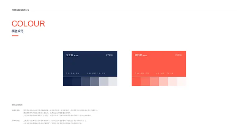 通过对业务目标用户及业务定位的了解,经过多方案尝试,我们最终确定大企业采购的品牌主题色为企业蓝+暖阳橙,企业蓝体现大企业采购的企业特性、专业感、并且具有B类业务的商务感,暖阳橙寓意阳光采购及效益提升,橙色系也是对1688品牌色的色系传承,同时也符合传统大型企业决策者暖色系的色彩偏好。(图2)(图2.1)