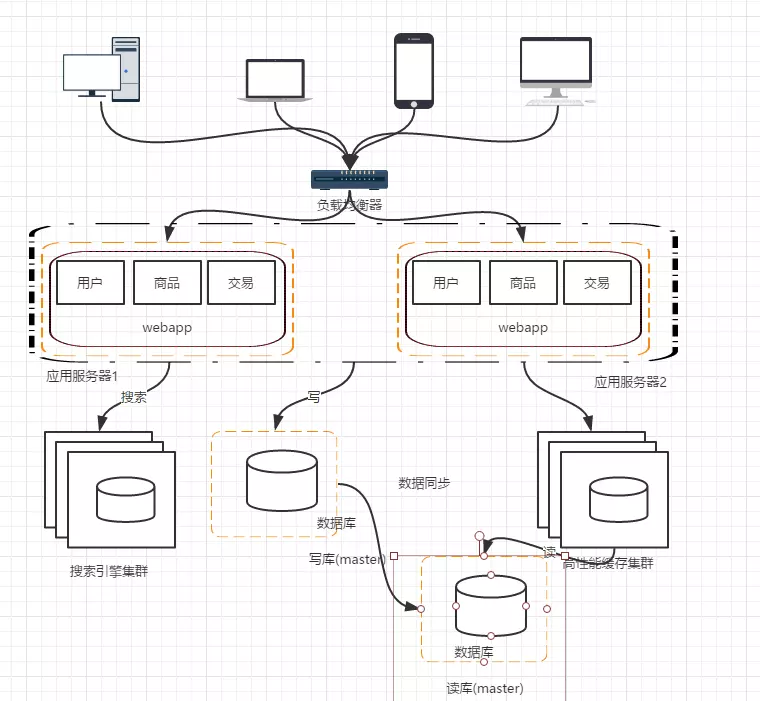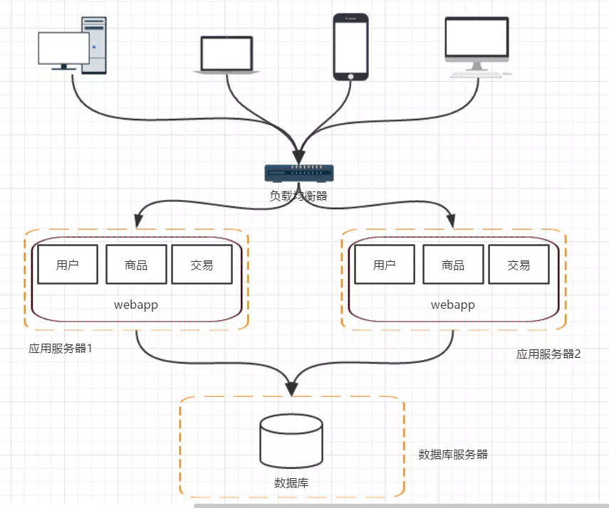 随着访问量的继续增加,单台应用服务器已经无法满足需求。在假设数据库服务器还没有遇到性能问题的时候,我们可以增加应用服务器,通过应用服务器集群将用户请求分流到各个服务器中,从而继续提升负载能力。此时多台应用服务器之间没有直接的交互,他们都是依赖数据库各自对外提供服务
