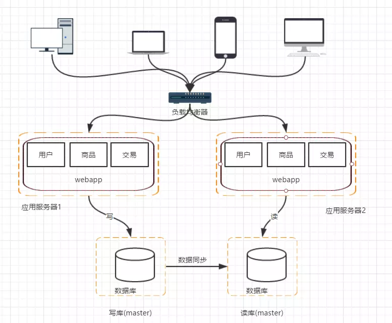 架构演变到这里,并不是终点。上面我们把应用层的性能拉上来了,但是数据库的负载也在慢慢增大,那么怎么去提高数据库层面的负载呢?有了前面的思路以后,自然会想到增加服务器。但是假如我们单纯的把数据库一分为二,然后对于后续数据库的请求,分别负载到两台数据库服务器上,那么一定会造成数据库不统一的问题。所以我们一般先考虑读写分离的方式