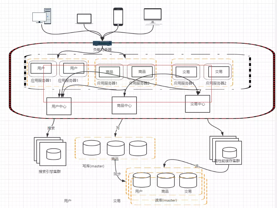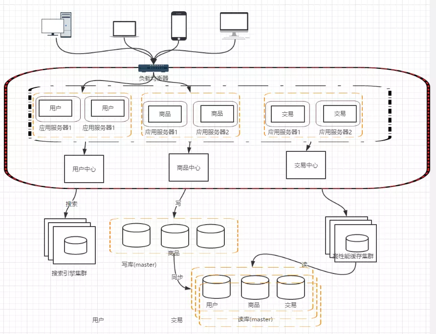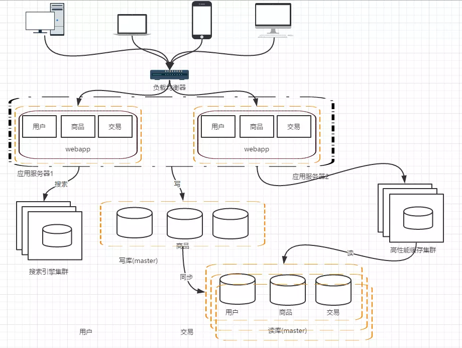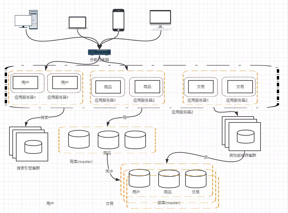 我们的网站演进的变化过程,交易、商品、用户的数据都还在同一个数据库中,尽管采取了增加缓存,读写分离的方式,但是随着数据库的压力持续增加,数据库的瓶颈仍然是个最大的问题。因此我们可以考虑对数据的垂直拆分和水平拆分