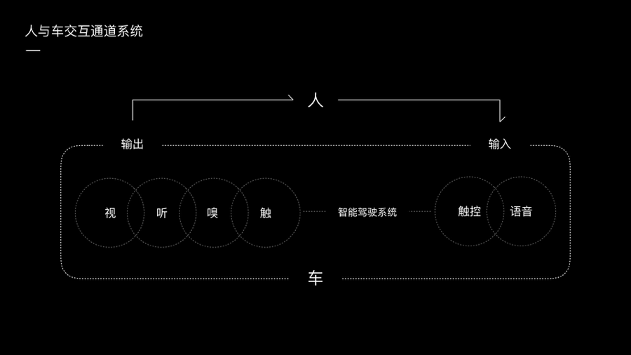 因此,我们试图从这种自然的交互关系出发,探索诱发用户“五感”感知的,人车交互系统。在系统的输入端,我们建立了触控加语音的交互通道,在输出端,尝试满足除“味觉”以外的所有感官通道的交互体验。