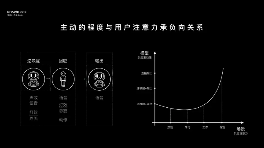 通过实验我们梳理和家居环境和工作环境下的八大场景,以及我们发现主动交流的程度和用户在当前任务下的注意力投射程度成反向关系。比如在家居环境下直接输出的主动交流模式,还是在工作场景下的主动交流模式更受欢迎。