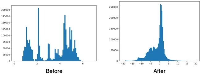 为了让你直观感受到批标准化的作用,以下是第一个卷积层分别在应用和未应用批标准化的情况下的输出直方图: