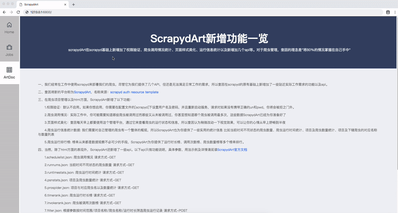 本小节,使用的项目为 arts,Scrapyd 服务为本地服务即 localhost:6800,所以这里以此作为基础进行演示。