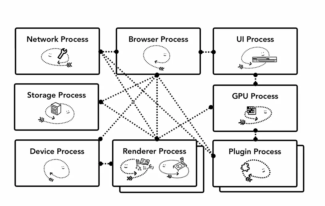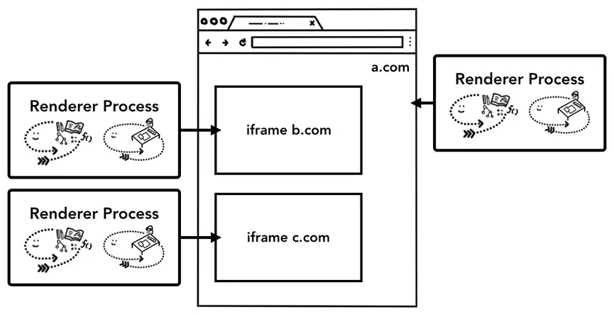 最重要的是浏览器进程,如何与负责应用程序不同部分的其他进程协调。对于渲染器进程,将创建多个进程,并将其分配给每个选项卡。直到最近,Chrome 才为每个标签提供了一个执行进程,现在它尝试为每个站点提供自己的进程,包括 iframe。