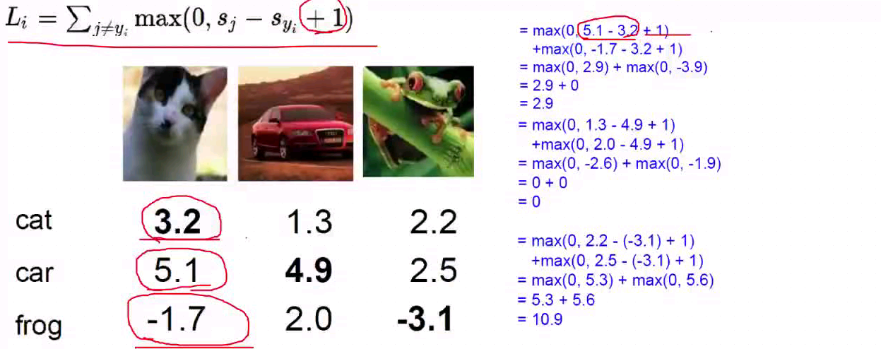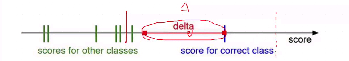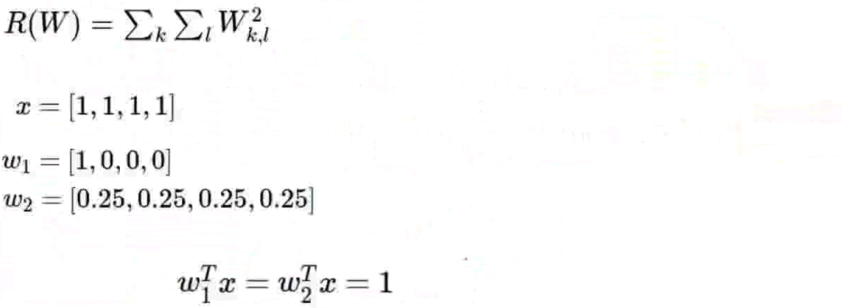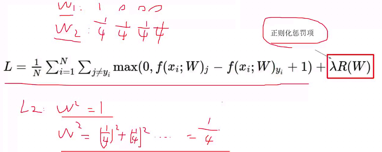 (深度学习)损失函数随记 wakacaca 2018-10-30 274 阅读1分钟 SVM损失函数: Li中的+1表示的是容忍程度。可以把+1变成+Δ,Δ可以是1也可以是10。 max的值表示只有比0大我们才认为有这样一个损失。如果比0小我们就认为他是没有损失的。 说明:如果预测的结果点落在绿色区域,这个点与蓝色区域的差值就会大于delta,那么此时的损失值是比较大的。在红色区间上的比较预测结果还行,但不是特别好。score值越高离错误分离的值就越远,损失值就越小。 说明:1/n表示去除样本个数对最终结果的影响,因为式子中有求和操作,而损失与样本个数是没有关系的。 w1和w2分别代表2个模型,看选那个模型好,两个模型的计算结果虽然一样,但是w1模型只关注一个像素点。w2模型关注的是整体(每个像素),分别均匀 可以防止过拟合。为了防止w1这种模型,我们可以加正则化惩罚项。 L2正则化 最终的损失函数