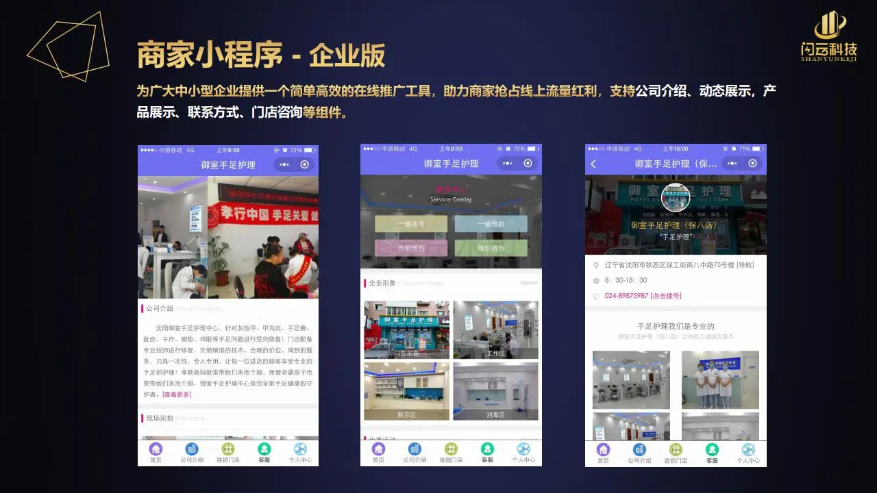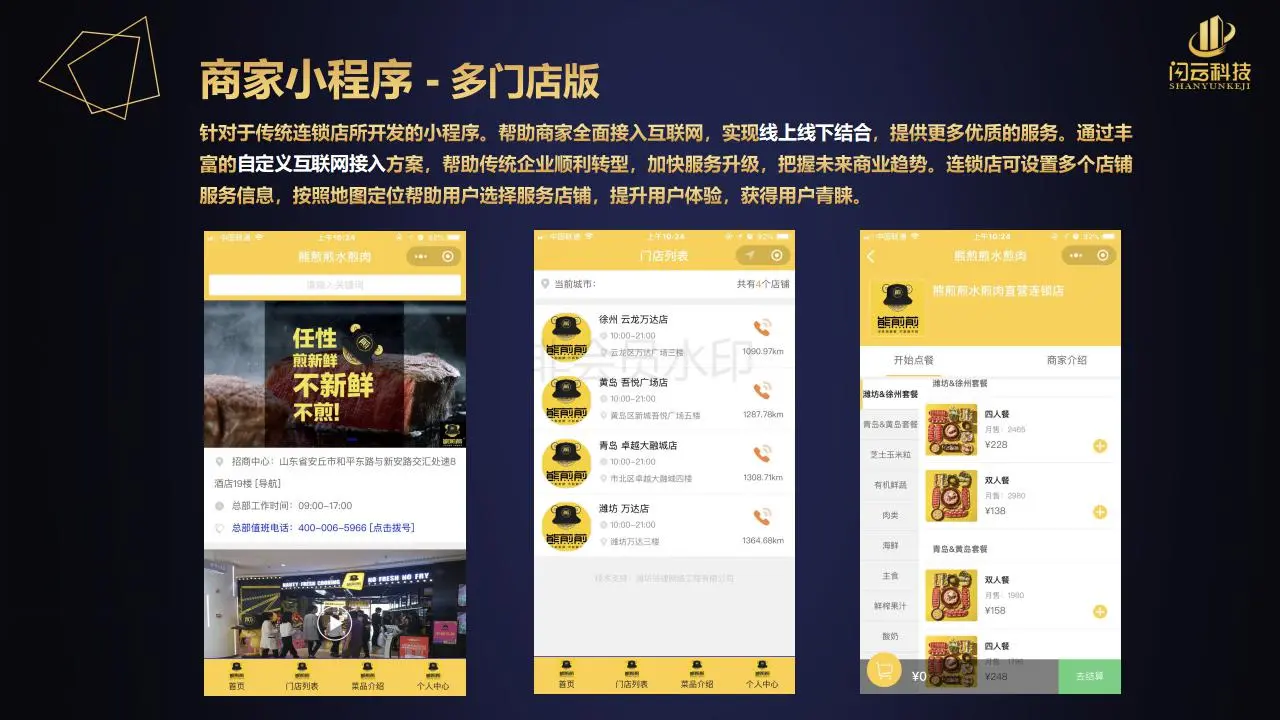多门店版小程序:针对于传统连锁店所开发的小程序。帮助传统多门店商家、企业全面接入互联网顺利转型,加快服务升级,把握未来商业趋势。连锁店可在一个小程序内设置多个店铺服务信息,按照地图定位帮助用户选择服务店铺,提升用户体验,获得用户青睐。适用行业:连锁门店、商圈、大型企业等。