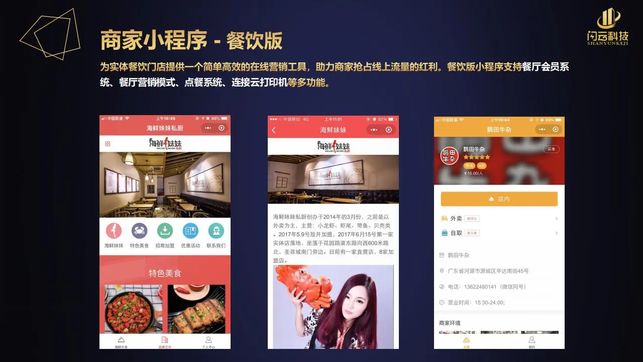 餐饮版小程序类似于美团,主要有预约、点餐、门店收款、卡券、会员、点评等功能,搭配砍价,拼团等营销插件,成为商家主要的线上流量入口,小程序已成为餐饮行业重要的客户流量渠道。广泛适用于各类餐饮行业。