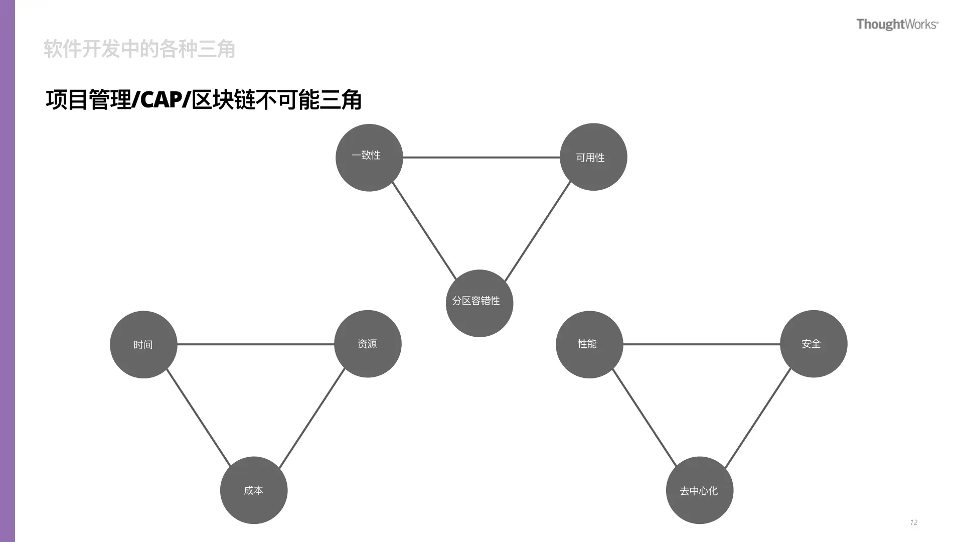 比如在敏捷项目管理中,我们常会听到时间,资源和成本的约束三角;在分布式计算中,著名的CAP(一致性,可用性和分区容错性)原理也是如此;还有区块链中的不可能三角(性能,安全和去中心化)。这些三角都在反映一种约束——不能完全同时满足,需要权衡。