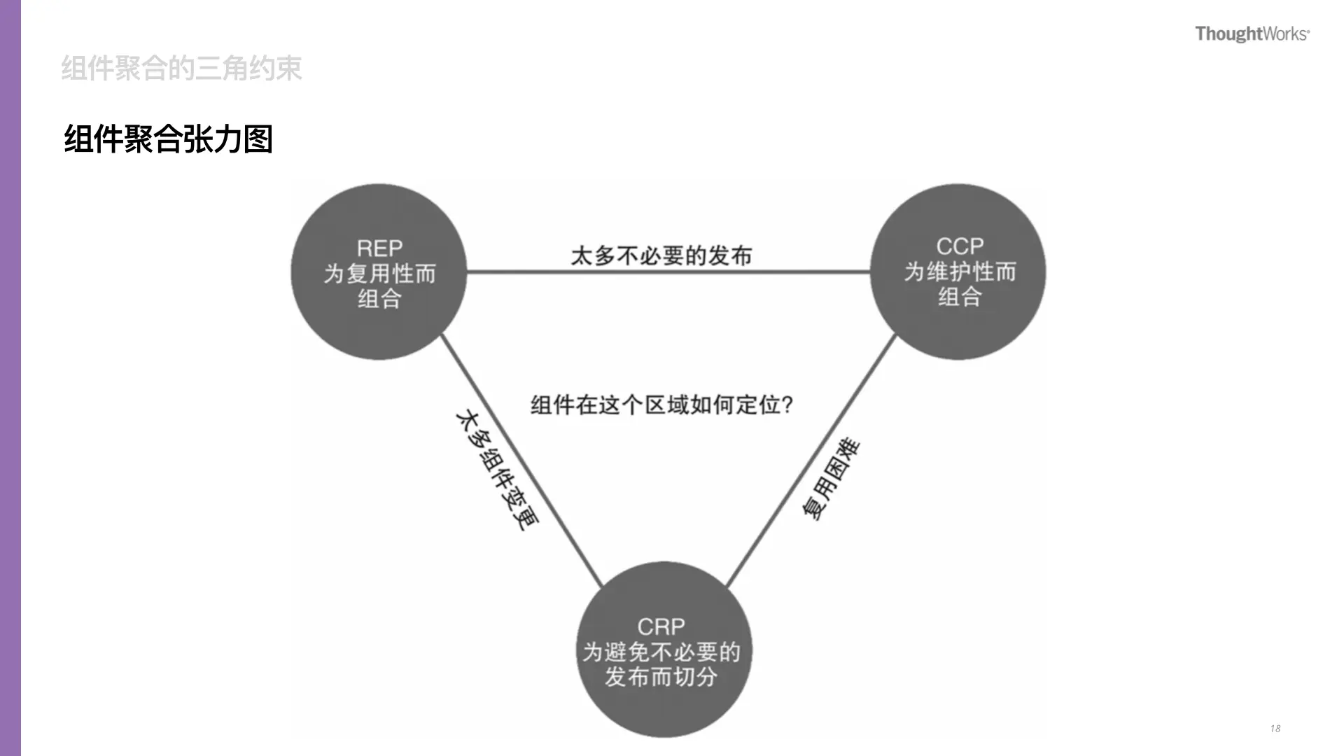 软件系统的生命周期里处处充斥着约束条件,每多一个环节往往就会多一种矛盾,进而衍生出多个方向的约束。组件聚合张力图反映的是发布和开发之间的矛盾,需要尽量遵循REP,CCP和CRP原则,满足其约束,才能减少变更成本。