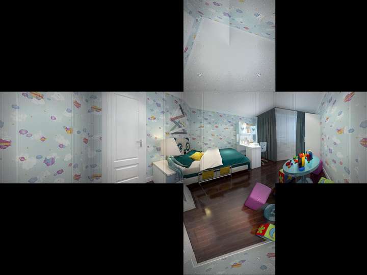 在立方体另外的五个平面上的投影也可以类似地得出。通过上述方法转换一张全景图,可以得到以下结果。