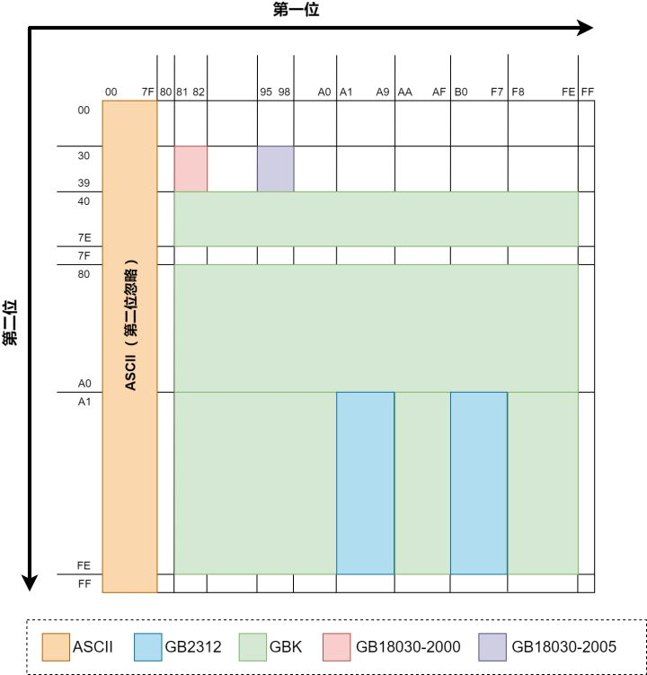 这图中展示了前文所述的几种编码在编码完成后,前2个byte的值域(用16进制表示)。每个byte可以表示00到FF(即0至255)。ASCII编码由于是单字节,所以没有第2位。因为GBK兼容GB2312,所以理论上上图中GB2312的领土面积也可以算在GBK的范围内,GB18030也同理。