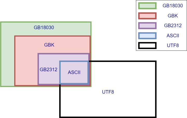 图中我们可以看出,ASCII被所有编码兼容,而最常见的UTF8与GBK之间除了ASCII部分之外没有交集,这也是平时业务中最常见的导致乱码场景,使用UTF8去读取GBK编码的文字,可能会看到各种乱码。而GB系列的几种编码,GB18030兼容GBK,GBK又兼容GB2312,下文细讲。