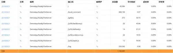 以服务名、接口名(URL-PATH 节)为纬度,统计总流量、平均耗时、超时率、异常率: