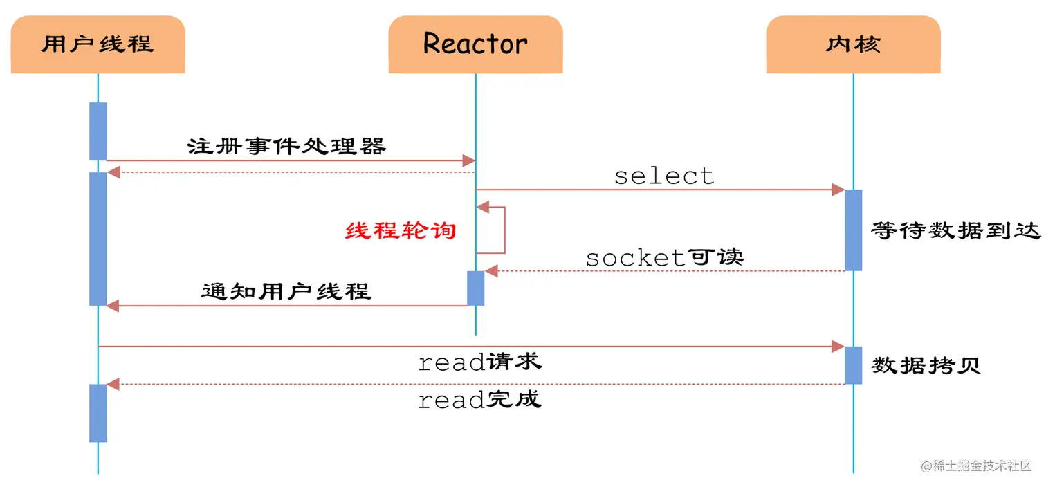 如图3所示,用户首先将需要进行IO操作的socket添加到select中,然后阻塞等待select系统调用返回。当数据到达时,socket被激活,select函数返回。用户线程正式发起read请求,读取数据并继续执行。