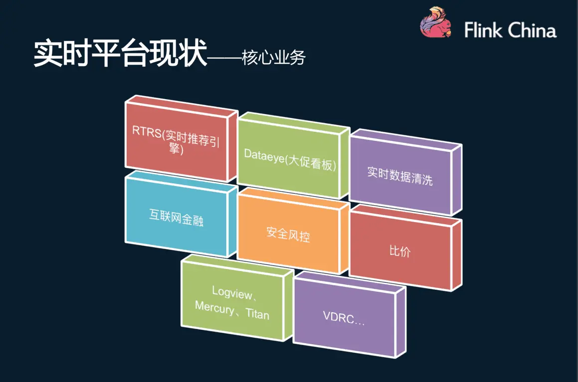 实时平台的核心业务包含八大部分:实时推荐作为电商的重点业务,包含多个实时特征;大促看板,包含各种维度的统计指标(例如:各种维度的订单、UV、转化率、漏斗等),供领导层、运营、产品决策使用;实时数据清洗,从用户埋点收集来数据,进行实时清洗和关联,为下游的各个业务提供更好的数据;此外还有互联网金融、安全风控、与友商比价等业务,以及 Logview、Mercury、Titan 作为内部服务的监控系统、VDRC 实时数据同步系统等。