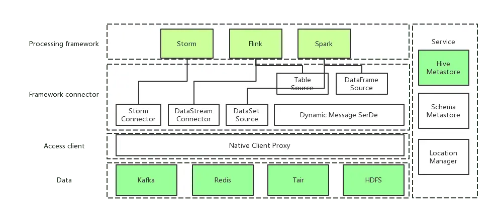 在Spark/Flink/Storm等框架中,以最适合使用的形式提供这些数据源的封装。