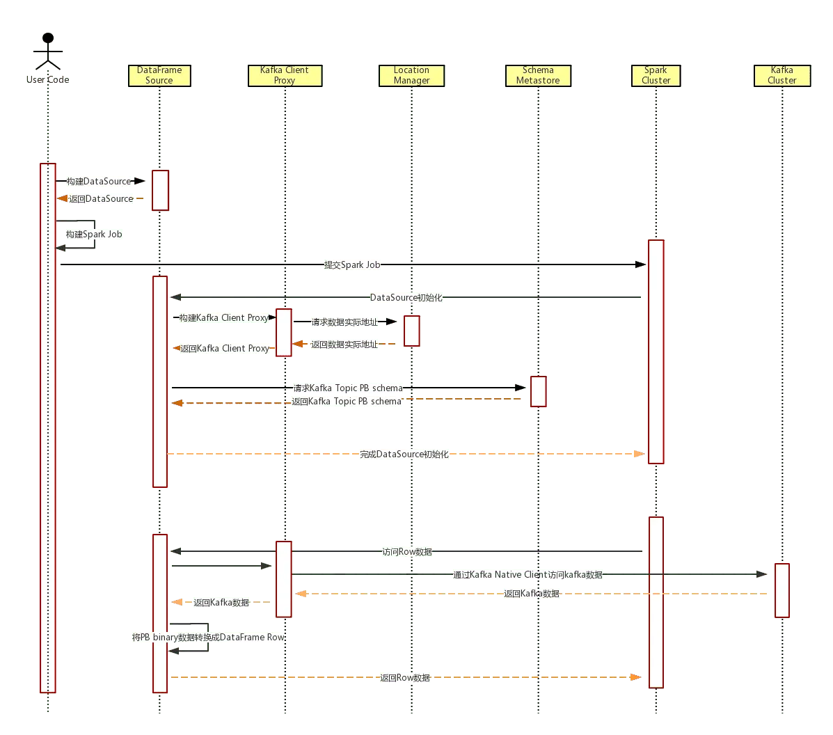 以Spark访问Kafka PB数据的时序图来说明UDM的内部流程