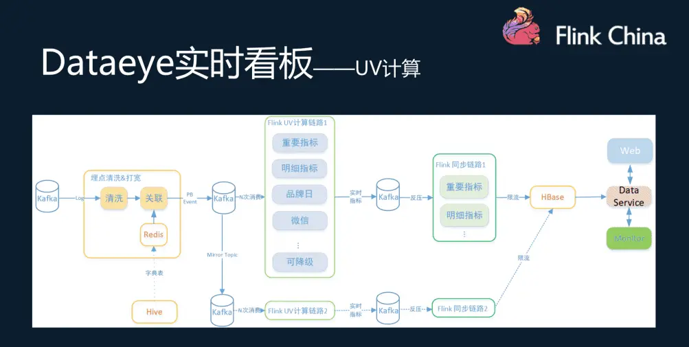 以 UV 计算为例,首先对 Kafka 内的埋点数据进行清洗,然后与Redis数据进行关联,关联好的数据写入Kafka中;后续 Flink 计算任务消费 Kafka 的关联数据。通常任务的计算结果的量也很大(由于计算维度和指标特别多,可以达到上千万),数据输出通过也是通过 Kafka 作为缓冲,最终使用同步任务同步到 HBase 中,作为实时数据展示。同步任务会对写入 HBase 的数据限流和同类型的指标合并,保护 HBase。与此同时还有另一路计算方案作为容灾。