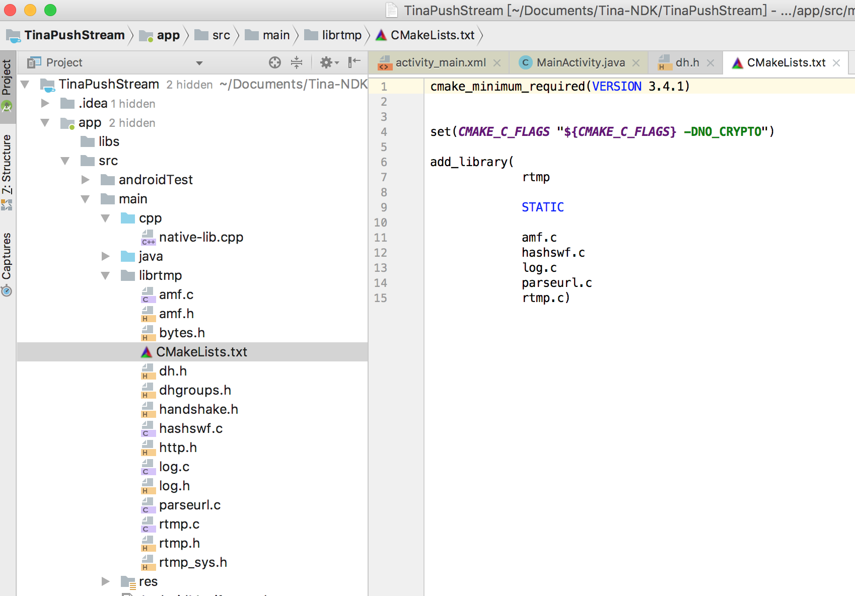 找到librtmp里把里面的.h、.c文件引入到 AS中工程里,结构如下: