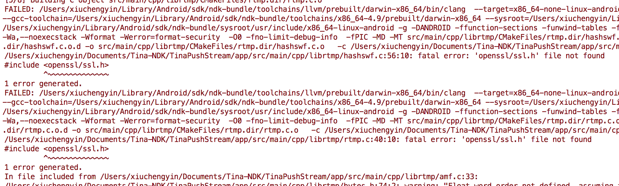 FAILED: : && /Users/xiuchengyin/Library/Android/sdk/ndk-bundle/toolchains/llvm/prebuilt/darwin-x86_64/bin/clang++ --target=x86_64-none-linux-android21 --gcc-toolchain=/Users/xiuchengyin/Library/Android/sdk/ndk-bundle/toolchains/x86_64-4.9/prebuilt/darwin-x86_64 --sysroot=/Users/xiuchengyin/Library/Android/sdk/ndk-bundle/sysroot -fPIC -isystem /Users/xiuchengyin/Library/Android/sdk/ndk-bundle/sysroot/usr/include/x86_64-linux-android -g -DANDROID -ffunction-sections -funwind-tables -fstack-protector-strong -no-canonical-prefixes -Wa,--noexecstack -Wformat -Werror=format-security -std=c++11 -L/Users/xiuchengyin/Documents/Tina-NDK/TinaPusher/app/src/main/cpp/libs/x86_64 -O0 -fno-limit-debug-info -Wl,--exclude-libs,libgcc.a -Wl,--exclude-libs,libatomic.a -nostdlib++ --sysroot /Users/xiuchengyin/Library/Android/sdk/ndk-bundle/platforms/android-21/arch-x86_64 -Wl,--build-id -Wl,--warn-shared-textrel -Wl,--fatal-warnings -L/Users/xiuchengyin/Library/Android/sdk/ndk-bundle/sources/cxx-stl/llvm-libc++/libs/x86_64 -Wl,--no-undefined -Wl,-z,noexecstack -Qunused-arguments -Wl,-z,relro -Wl,-z,now -shared -Wl,-soname,libnative-lib.so -o ../../../../build/intermediates/cmake/debug/obj/x86_64/libnative-lib.so CMakeFiles/native-lib.dir/src/main/cpp/native-lib.cpp.o src/main/cpp/librtmp/librtmp.a -lx264 -llog -latomic -lm "/Users/xiuchengyin/Library/Android/sdk/ndk-bundle/sources/cxx-stl/llvm-libc++/libs/x86_64/libc++_static.a" "/Users/xiuchengyin/Library/Android/sdk/ndk-bundle/sources/cxx-stl/llvm-libc++/libs/x86_64/libc++abi.a" && :