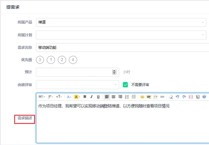 (禅道项目管理软件中的用户需求界面)