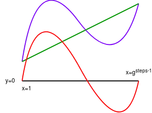 -紫色:计算轨迹多项式 (P) 。绿色:插值 (I)(注意插值是如何构造的,其在 x = 1 处等于输入(应该是计算轨迹的第一步),在 x=g^(steps-1) 处等于输出(应该是计算轨迹的最后一步)。红色:P-I。黄色:在x = 1和 x=g^(steps-1)(即 Z2)处等于 0 的最小多项式。粉红色:(P – I) / Z2。-