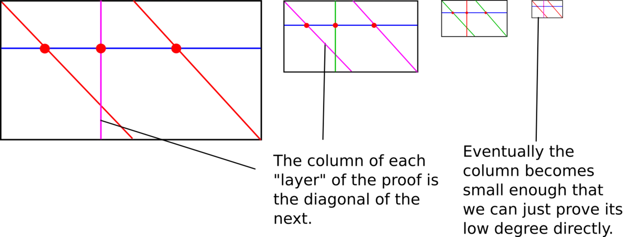 我们采用递归的方法,有两种情况。首先,如果次数足够低,我们只需提供完整的值列表作为证明,这是“基本情况”。对基本情况的验证十分简单:进行 FFT 或拉格朗日插值或其它对表示这些值的多项式插值,并验证其次数小于 N 的方法。否则,如果次数高于某个设定的最小值,我们将进行第 2 部分最后介绍的垂线 –对角线技巧。
