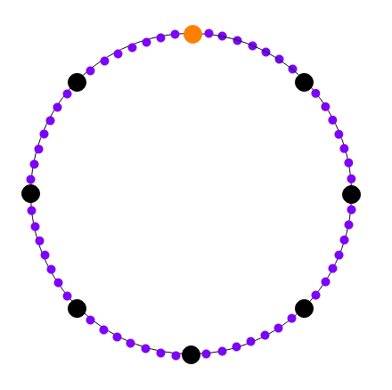 -黑色: g1 的幂。紫色: g2 的幂。橙色:1。你可以将连续的单位根看作一个按这种方式排列的圆圈。我们沿着 g1的幂“放置”计算轨迹,然后扩展它来计算在中间值处(即 g2 的幂)的相同多项式的值。-