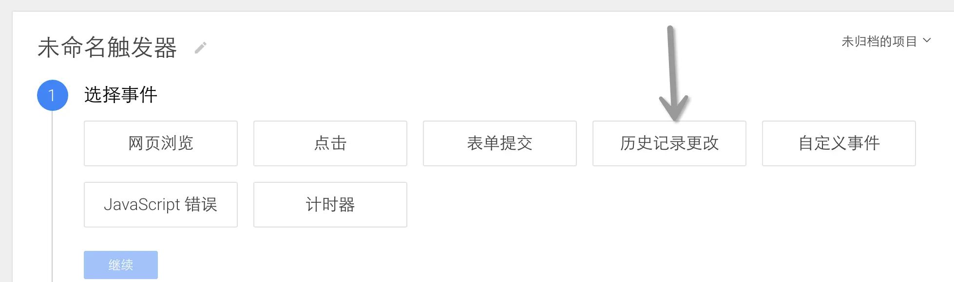 所以我们只需要在 tagmanager 中找到这样一个触发时机即可,在新建触发器(triggers)时,伟大的谷歌再次让我膜拜,我发现一个内置的触发器叫做【历史记录更改】,它的意思是只要是网址发送了变化,就会触发,简直就是为单应用定制的触发器。