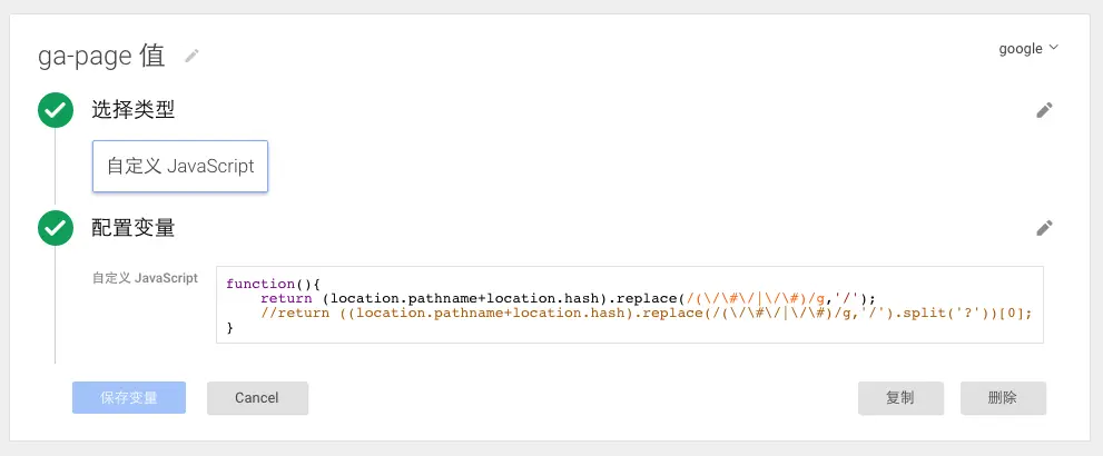 -》字段名称填入 page,值填入本页面的 page 值(这里我有使用了一个自定义的变量 ga-page 值,后边讲解怎么设置)