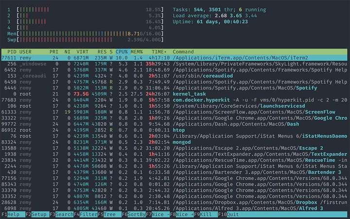 不过,htop 是对 Linux 上的 top 和 Mac 上蹩脚的 top 的极大改进。它增加了包括颜色输出,键盘热键绑定以及不同的视图输出,这对理解进程之间的父子关系有极大帮助。