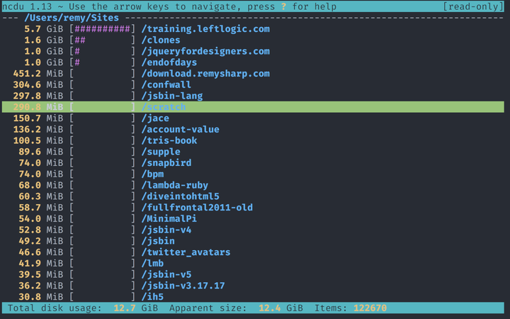 ncdu 是一个非常棒的替代品。它提供了一个交互式的界面并且允许快速的扫描那些占用了大量磁盘空间的目录和文件,它又快又准。(尽管不管在哪个工具的情况下,扫描我的 home 目录都要很长时间,它有 550G)