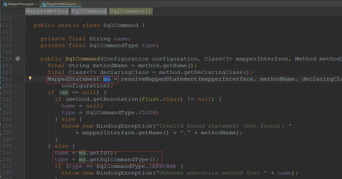 - SqlCommand主要保存了要查询的这个接口方法的方法名称和SQL查询类型,这两个值都需要先查询MappedStatemen